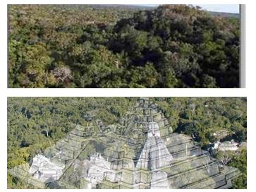 Top image: Dense tropical rainforest conceals the monumental El Mirador pyramid complex in northern Guatemala.