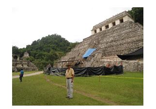 In the foreground stands the famous Temple of the Inscriptions, a stepped pyramid with one of the longest known Maya glyphic texts. Excavation and stabilization are still ongoing, as seen by the protective scaffolding and tents.