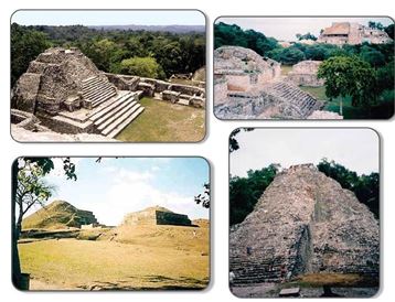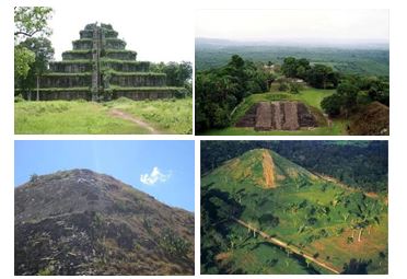 Upper left: The Caana Pyramid in Caracol, Belize — the tallest ancient structure in the country rises above the canopy after full forest clearing and reconstruction. Caracol is now one of the most visited archaeological parks in Belize.