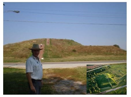 Main image: The author stands before Monks Mound, whose stepped sides and symmetrical layout are obscured by grass but remain geometrically defined. Inset image