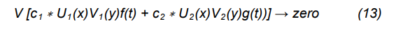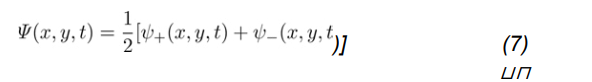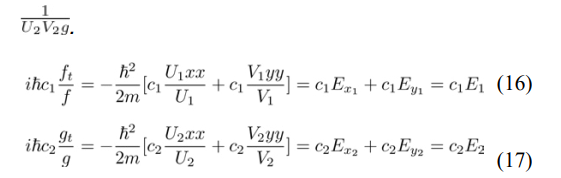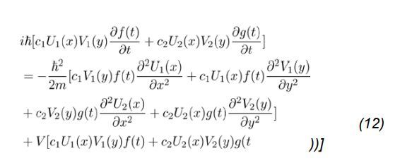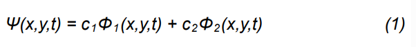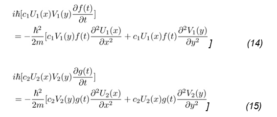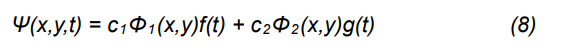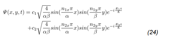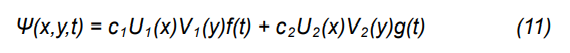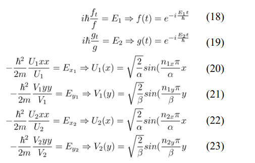 The wave function Ψ can be solved using the method of separation of the variable of the linear combination of quantum energy (1). The solution is determined by the product of the sum of the waves and two functions of time t.