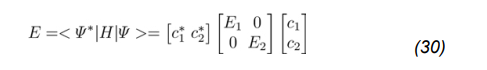Next, we consider the density functional theory to compute the wave function of the quantum energy particle in the bulk configuration. We use the operator of the Schrödinger equation, the Hamiltonian, to find the wave function in a linear combination of two states.