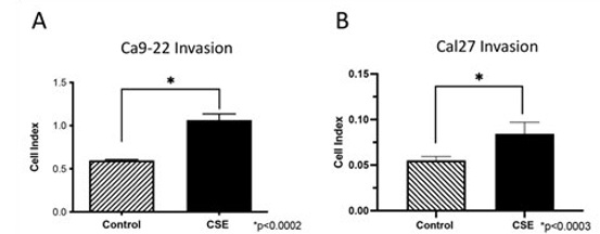 Figure 2: Invasiveness of Ca9-22 cells and Cal27 following exposure to CSE. Real-time invasion of Ca9-22 (A) and Cal27 (B) cells was significantly increased following exposure to CSE when compared to controls. *Statistically different from control (P < 0.05).