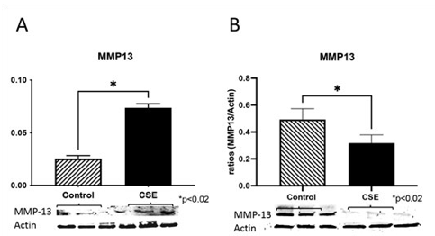Figure 4: Expression of matrix metalloproteinase (MMP)-13 following CSE treatment. Western blot analysis revealed increased expression of MMP-13 (2.9-fold; p<0.02) by Ca9-22 cells treated with CSE when compared to controls (A). CSE treatment decreased MMP-13 expression(1.5-fold; p<0.02) in Cal27 cells compared to controls (B). *Statistically different from control (P < 0.05).
