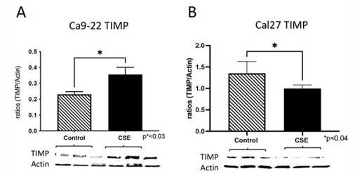 Figure 5: Expression of tissue inhibitor of metalloproteinases (TIMP) during CSE treatment. Immunoblotting revealed increased expression of TIMP (1.5-fold; p<0.03) by Ca9-22 cells treated with CSE when compared to controls (A). CSE treatment decreased TIMP expression (1.2-fold; p<0.04) in Cal27 cells compared to controls (B). *Statistically different from control (P < 0.05).