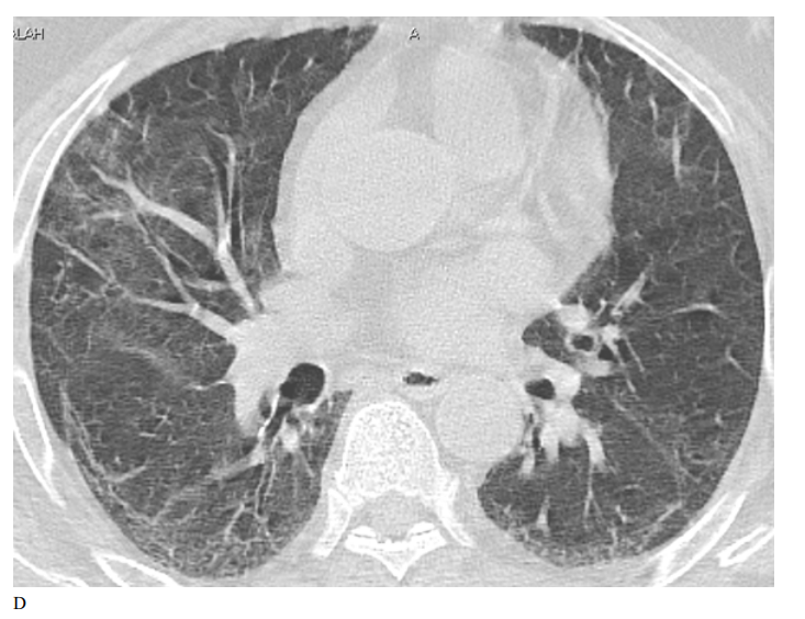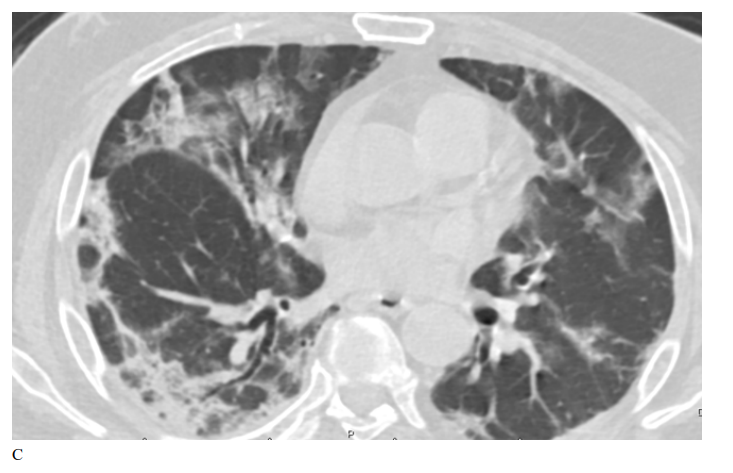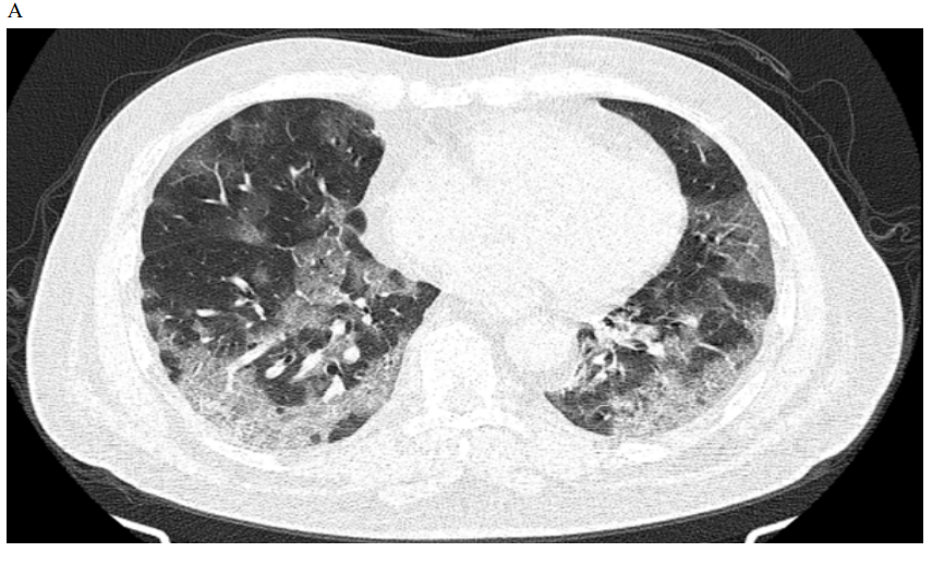 Figure 2: Male patient in remdesivir group shows bilateral ground glass opacities affecting mainly upper lobes and pleural based with small areas of atelectatic bands, Covid severity score 18, while figure D 3 months after treatment shows marked improvement of already present infiltrates with Covid severity score 8.