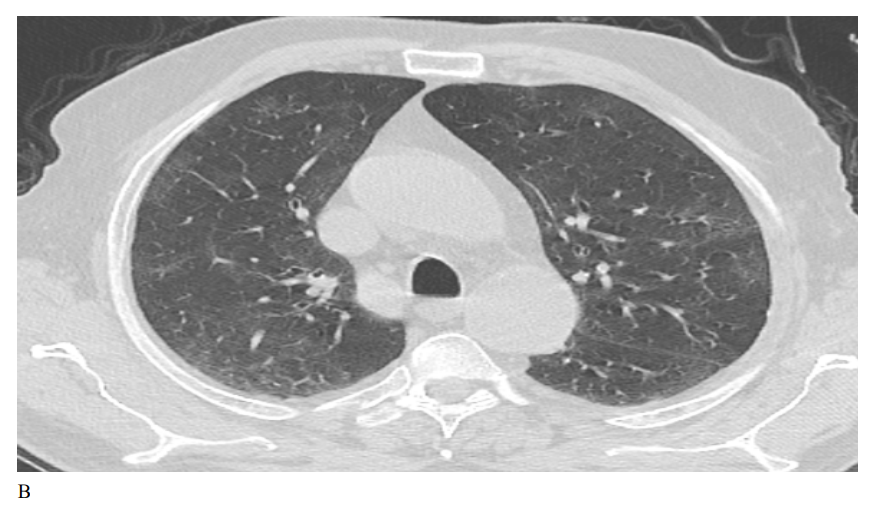 Figure 1: Male patient in favipiravir group shows (A) bilateral lung infiltration with areas of ground glass opacities and peripheral pleural based consolidation, Covid severity score 12, Corad 5. (B) After 3 months of therapy, Improvement of bilateral pulmonary infiltrates with residual basal ground glass opacities, Covid severity score 5.