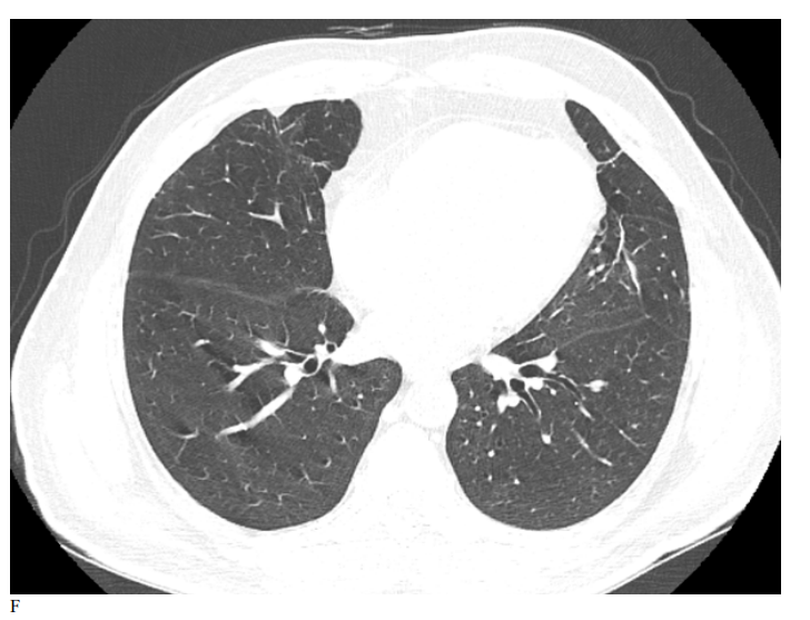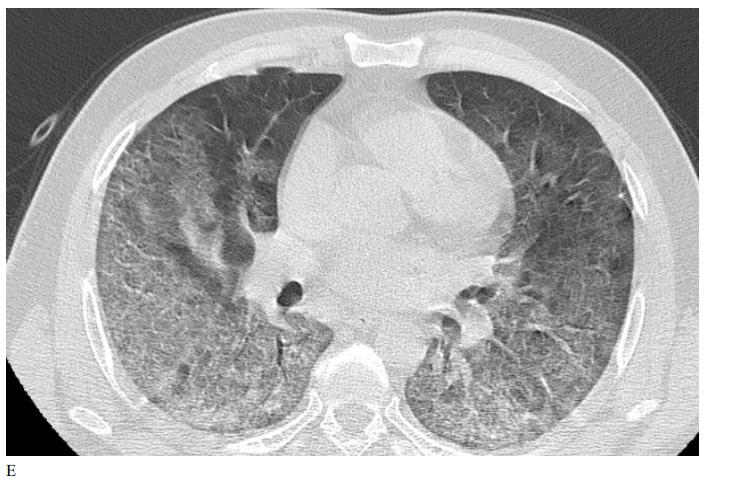 Figure 3: Male patient in NRIZ group shows diffuse bilateral ground glass opacities with alveolar infiltration mainly lower lobes, Covid severity score 12; while figure E After 03 months treatment shows marked resolutions of pervious bilateral pulmonary ground glass opacities and alveolar infiltrates, Covid severity score 6.