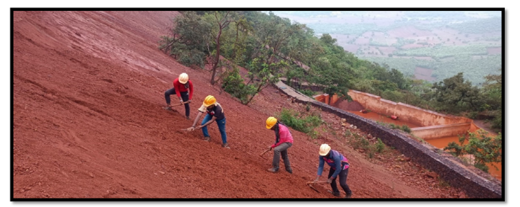 Over burden dumps/waste dumps get generated in the mines due to opening and expansion of mining pits, formation of benches etc. It contains parts of soil, gravel and stones of very low-grade iron ore (Figure-3). If they are not rehabilitated properly, it results to flow of sediments and other materials into nala/stream courses, which contaminate the forest, agriculture and horticulture crops down below the mine lease area and in distant surroundings. Therefore, to stabilize the waste dumps and to protect the biodiversity, the rehabilitation and reclamation of dumps is a prerequisite. The existing dumps needs to be treated by using physical and biological measures. The details of physical engineering measures such as Construction of retaining wall (Figures-3), garland drains (Figures-4), formation of benches, and others had been carried out.