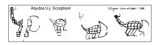 Bone and ivory fragments bearing short inscribed marks were also unearthed from the U-j tomb, representing the earliest known evidence of writing in Egypt. Among the most significant discoveries were 160 bone and ivory tags, each approximately the size of a postage stamp and incised with simple motifs. G. Dreyer of the German Institute of Archaeology in Cairo identified these carvings as the earliest known Egyptian hieroglyphics. The most frequently recurring pictographic symbol among these inscriptions is the scorpion. It is this recurring motif that has led to the tomb's owner being identified and named as "King Scorpion."