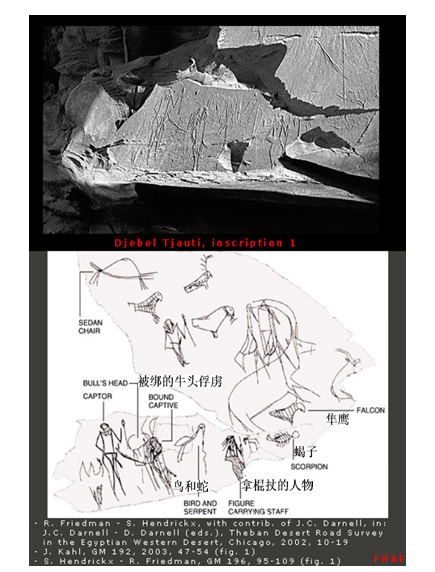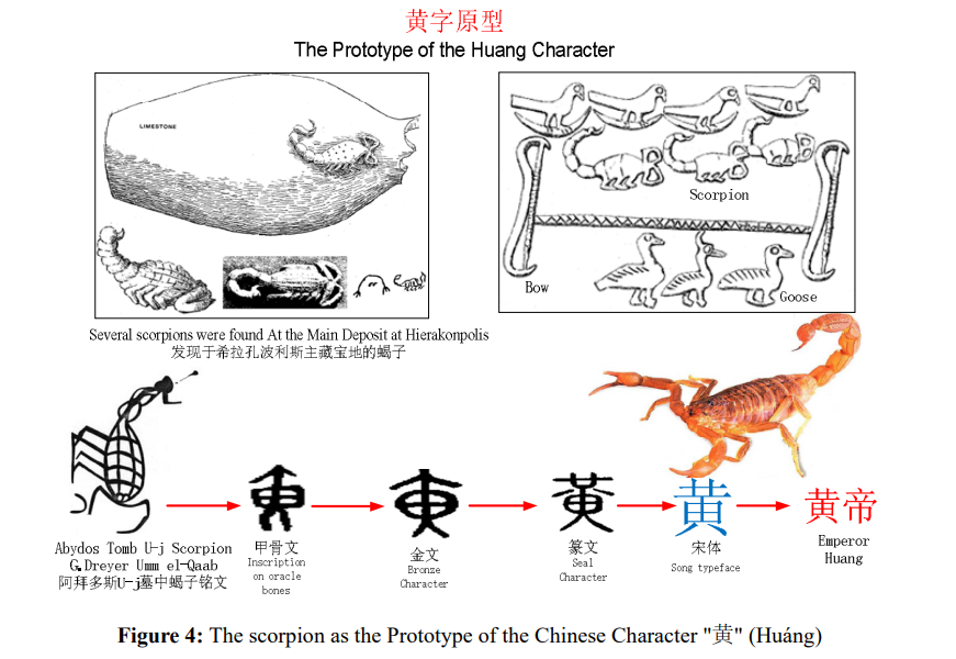 Figure 3 showcases a circa 3200-3000 BCE rock inscription discovered at Djebel Tjauti in the desert west of Luxor, which bears the symbolic identifier of King Scorpion. The scene depicts a defeated ruler, denoted by a bull-horn headdress, with his hands bound behind his back and being led away by a figure holding a rope. A scorpion symbol is prominently featured in the lower right section of the tableau, with a falcon depicted above it. This iconographic composition is interpreted as a likely representation of the conflict between the Huang Emperor (Yellow Emperor) and the Yan Emperor. Adjacent to this scene, a secondary motif of a bird pecking a snake further supports this interpretation. It is posited that this symbolizes the Upper Egyptian group—represented by the falcon (bird) totem and associated with the Yellow Emperor— achieving victory over the Lower Egyptian group, symbolized by the serpent totem and linked here to the Yan Emperor.Comparative textual analysis supports the logical reasoning presented above. The scorpion symbol discovered in the tomb of King Scorpion I bears a striking resemblance to the earliest form of the Chinese character