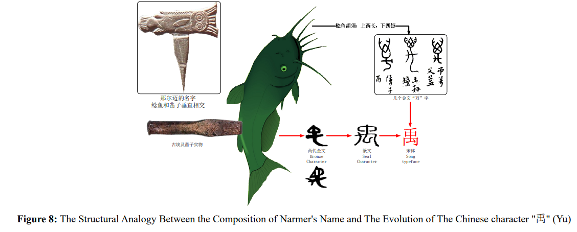 In fact, a more compelling parallel can be drawn between Narmer and Yu the Great, the legendary founder of the Xia Dynasty in Chinese historical records. The structural composition of Narmer's name exhibits a notable similarity to the character for "Yu" ![]()