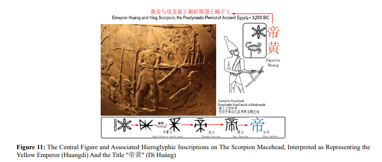 • Identity Correspondence: Historical and archaeological evidence indicates that King Scorpion defeated a ruler symbolized by a bull's head, leading to the unification of Upper and Lower Egypt. This event parallels the Chinese historical account of the Huang Emperor defeating the Yan Emperor, whose iconography similarly included a bull-head emblem, resulting in the unification of the Yan and Huang tribal confederacies.