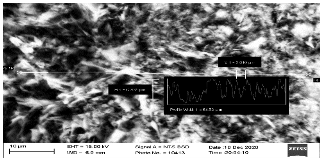 In Figure 5, in an area measuring 64.5 x 6.7 µm, you can see the morphology of the surface of the powders in the form of a developed porous-fibrous structure and notice a change in the contrast of the surface relief due to the heterogeneity of the agglomerate structure. Therefore, we measured the sizes of individual particles after dispersing the agglomerates with ultrasonic waves.