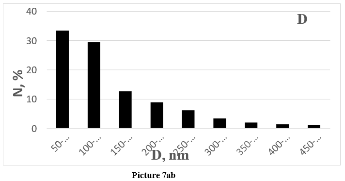 Picture 7: Size distribution of synthesized amorphous SiO2 nanoparticles and corresponding histograms of the distribution of the number (N) of synthesized particles by size.