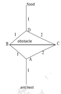 Suppose there are two paths around the obstacle leading from the ant's Nest to the Food source: Nest-abd-food and Nest-acd- food, with lengths of 4 and 6, respectively. Ants can travel a unit length of distance per unit of time, starting with no pheromones left on any of the roads.