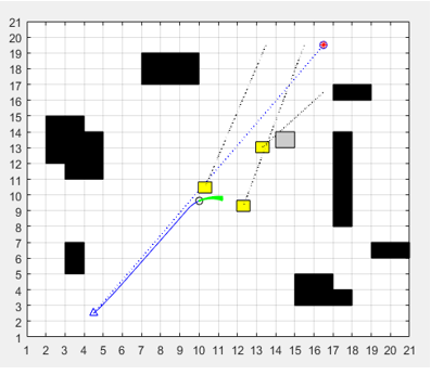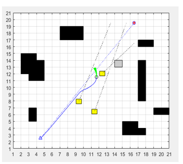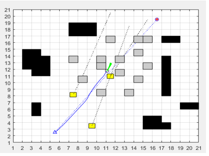 This experiment is an extended version of experiment 2, the main purpose of which is to verify the collision avoidance effect of fusion algorithm on multi-target dynamic obstacles and unknown static obstacles. Dynamic and static unknown obstacles are added to the aforementioned robot path environment. The simulation test of robot path planning under multi-target dynamic and static obstacles environment is shown in Figure 14.
