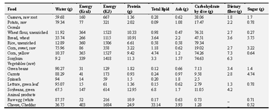 Table 3 shows The water content of cassava were compared with some foods like potato, raw egg, raw fish, milk, soybeans, carrots, green beans and lettuce, and the water content of these foods are higher than that of cassava root. Water content cassava flour was much higher than cheese, sorghum, corn, rice and wheat which are consumed by human beings frequently in different countries. Cassava root has higher energy than other sources of energy giving food components, least in protein content and it has relatively rich in sugar. The water content of cassava root is relatively at moderate level compared to others which attribute and important water to the human body for body functionality also its ash content is lower than other.
