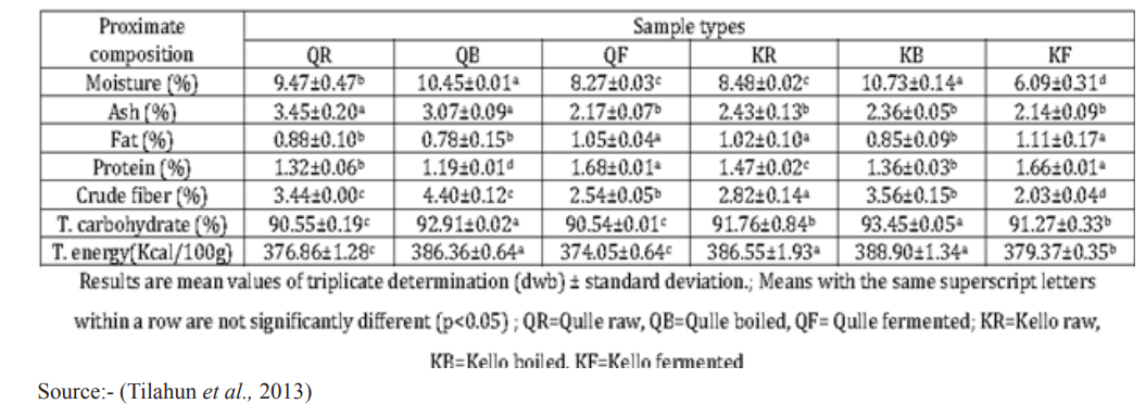 Total carbohydrate content of Qulle and Kello flour samples are reported Table 2. Qulle flour was found to have 90.54±0.01% total carbohydrate for raw, 92.91±0.02% for boiled and 90.54±0.01% for fermented samples, Kello flour was found to have 91.76±0.84%, 93.45±0.05% and 91.27±0.33% for raw boiled and fermented samples respectively. Boiling significantly (P≤0.05) increased the carbohydrate content of flour samples in both varieties. The finding of agrees with the reported value by Bradbury and Holloway, in which the total carbohydrate content is 92.81±0.07% for raw cassava flour samples and 89.42±0.06% for fermented cassava flour samples [20]. This can be due to the action of microbial enzymes that are capable of hydrolyzing carbohydrate into simple sugars, which the organism could use as its carbon source and transform it to other macromolecules or metabolites such as protein and fat [21].