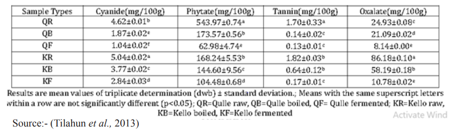 Tilahun et al., justifies that anti-nutritional factors are presented in Table 7 of Qulle and Kello cassava flour samples. Cyanide content was significantly (P≤0.05) reduced by boiling and fermentation process. The cyanide content recorded as 4.62±0.01mg/100g in raw Qulle flour was found reduced to a level of 1.87±0.02mg/100g by boiling and 1.04±0.02mg/100g by fermentation process. Similarly, from 5.04±0.02mg/100g in raw Kello flour reduced to a level of 3.77±0.02mg/100g by boiling and to 2.84±0.03mg/100g by fermentation process. The reduction of cyanide content by boiling and fermentation process has also been reported by other workers (26), in which the cyanide content was reduced from 10.9±0.3 to 3.4±0.4 (mg/kg). This is due to natural fermentation in which the microorganisms are capable of utilizing cyanogenic glycosides and the breakdown products in to other forms such as hydrogen cyanides and cyanohydrins. Raw Qulle flour sample containing 543.97±0.74mg/100g was reduced to 173.57±0.56mg/100g by boiling and to 62.98±4.74mg/100g by fermentation process.