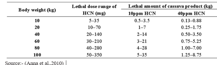 Table 11. Minimum lethal dose ranges of hydrogen cyanide (HCN) in humans per body weight and the amount of cassava product, containing 10 ppm and 40 ppm HCN, required to reach these lethal doses