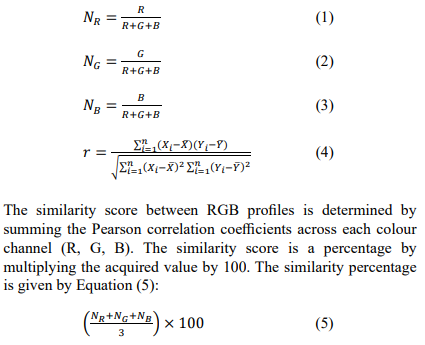 Consequently, ink analyses are categorised into two primary types: Chromatographic Methods and Spectroscopic Methods. TLC was chosen for this experiment because it is the simplest of those methods and hasan effective separation of dyestuff components[3-4].Then, this traditional method is combined with an innovative process called image analysis.The proposed method presents a novel and expedited technique for data collecting by creating specialised image analysis software designed to assess thin layer chromatograms-image analysis (TLC-IA) utilising a regular office scanner to get RGB (red, blue, green), thereby obviating the necessity for costly apparatus. This technique facilitates the comparison of two inks by evaluating their Rf values, colour spectrum, and intensity of their separated constituents. It yields dependable outcomes for ink analysis and functions as an effective instrument for the comparative assessment of similarly hued inks, paints, fibres, and other materials pertinent to forensics. Normalisation is essential for facilitating the comparison of RGB profiles across several images; this is accomplished by calibrating the values to a standardised range. This guarantees that each channel exerts an equivalent influence in the analysis. Normalising values to the range of 0-1 guarantees that the colour channels are uniformly calibrated, which is crucial for precise comparison and analysis. This inhibits any channel from disproportionately affecting the outcomes. Furthermore, the data needs to possess a uniform scale and distribution in statistical analyses, such as correlation. To normalise RGB profiles, each colour channel's value is divided by the total of the colour values. This method computes the ratio of each channel concerning the total intensity, ensuring that the channel values are confined within the range of 0 to 1. The normalised RGB colour components were computed using the subsequent equations (1,2,3). Following the normalisation procedure, Pearson's correlation coefficient is employed to quantify the extent of the linear relationship between two datasets. Pearson's correlation coefficientEquation (4) is computed using the subsequent formula[16-26].