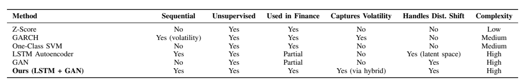 A comparative summary of key methods is shown in Table I. Machine learning-based anomaly detection has since gained traction, particularly through unsupervised algorithms such as One-Class Support Vector Machines (SVM) and Isolation Forests [15,16]. These models can detect outliers without labeled data but often disregard temporal dependencies—an essential feature of financial data.