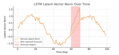 Figure 2: Latent Vector Norm Over Time. A clear increase occurs during the anomaly window, indicating structural change detected by the Autoencoder