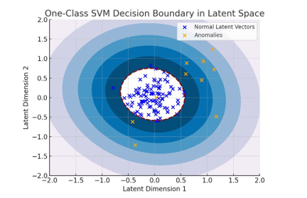 To further illustrate how anomalies are separated, Figure 3 presents the latent space decision boundary learned by the One- Class SVM. Normal vectors cluster tightly in a welldefined region, while anomalies appear outside the boundary,