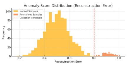 Additionally, Figure 4 presents the reconstruction error distribution used by the GAN to assign anomaly scores. The histogram reveals a distinct separation between normal and anomalous samples, supporting the use of a percentile-based threshold.