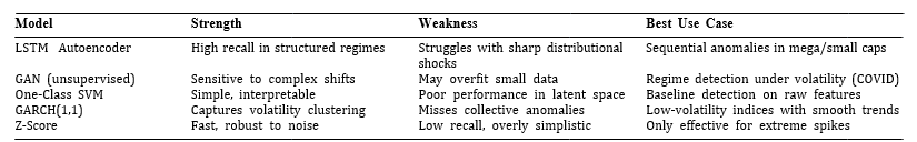 As shown in Table III, deep models adapt more effectively to structural changes across both stable and turbulent markets. Hybrid approaches—especially those combining LSTM and GAN—show potential in balancing detection accuracy with generalizability across asset types and macroeconomic conditions.