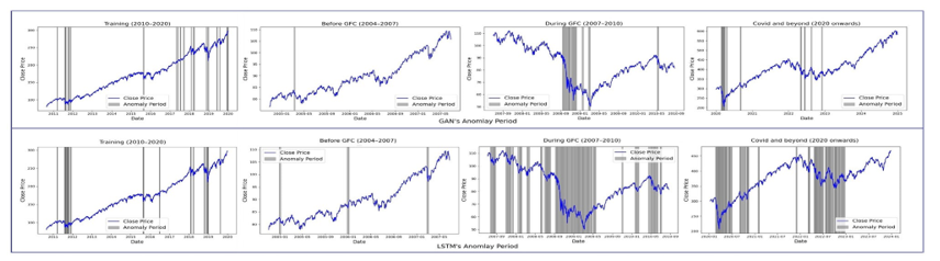 We further evaluate the model’s behavior during periods of pronounced market turbulence, specifically the 2008 Global Financial Crisis and the COVID-19 shock. As shown in Figure 7, both models demonstrate a notable increase in detected anomalies that aligns closely with these historical dislocations, reflecting a meaningful sensitivity to structural disruptions in the financial system. The figure provides a side-by-side comparison of anomaly period detection using GAN-based and LSTM-based models applied to financial time series. Each panel plots closing prices over time, with grey-shaded regions indicating periods classified as anomalous. The upper row presents the GAN results, which display a more conservative detection pattern—identifying anomalies primarily around sharp downturns during the training window (2010–2020), distinctly flagging the Global Financial Crisis (2007–2010), and selectively capturing major corrections in the post-COVID era. In contrast, the LSTM model results, shown in the lower row, reveal a denser and more sensitive detection profile. While both models report minimal anomalies before the GFC, the LSTM detects significantly more anomalies during the crisis and highlights broader periods of instability after 2020.
