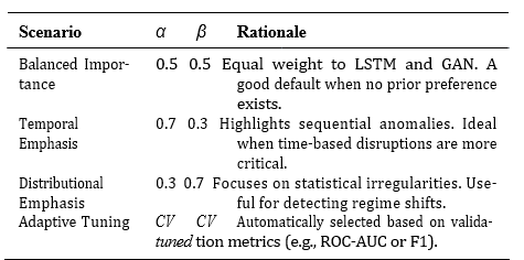 Table V outlines common configurations of α and β, highlighting how users may adapt the framework based on their anomaly detection goals. In summary, our unified architecture not only outperforms traditional benchmarks but also offers flexibility and robustness across different market conditions. Its adaptability and interpretability make it a valuable tool for financial anomaly detection and early warning systems.