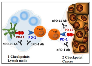After chemotherapy treatment, tumor antigens are taken up by cells presenting antigen (APC) and are presented in the context of the co-stimulatory molecules B7 from dendritic cells. T cells recognize antigens to become activated. T-cells may differentiate into memory T cells that can turn into tumor recurring presence not only through induction of genetic programs, which leads to a proliferation and differentiation, but also to induce receptor inhibitor mediated by CTLA-4 program, which ultimately is going to stop proliferation. As T-cell receptor CTLA-4, T-cell receptors, PD-1 is expressed only in activated T cells to stop. In many laboratory studies, today are ongoing the clinical trials with anti-CTLA-4 and immunological control points, i.e. PD-1 / PDL1 can improve the prospects of patients with various malignancies (Figure 3) [16].