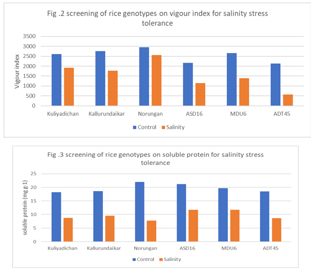 Attempts to measure the tolerance capacity in a genotypes or hybrid with single parameter have limited value because of the multiplicity of the factors and their interactions contributing to salinity tolerance. Different researchers used different traits to appraise genetic variances in salinity tolerance. Hence, in the present study, rice genotypes and hybrids have been selected to assess their tolerant capacity under salinity and the various traits contributing to salinity tolerance during germination and seedling establishment stage of the crop with the following objectives viz., To investigate the germination, physiological and biochemical responses of rice genotypes to salinity stress at germination level and To screen the rice genotypes that are tolerant and perform good to the induced salinity stress conditions.