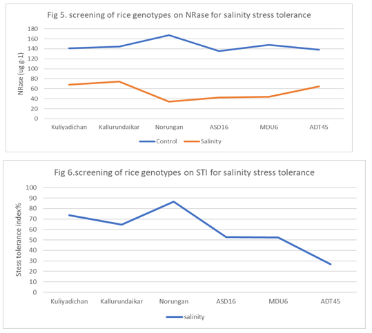 Table 4. Screening of rice genotypes on NRase and alpha amylase enzyme activity for water and salinity stress tolerance.
