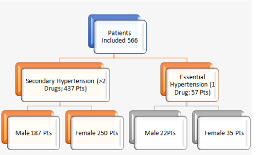 This study was conducted with prospective analysis of 566 hy- pertensive patients at Private clinic in Karachi referred by gen-eral practitioners for control of hypertension from May 2017 to June 2018. Medical records of patients (187M/250F) were taken, aged 30.1±8.2 years (ranging: 15-40 years), with no family histo- ry or other risk factors having maximum systolic blood pressure of 190.8±29.4 mmHg (ranging: 140-230 mm Hg), and maximum diastolic blood pressure of 108.8±16.8 mmHg (ranging: 90-150 mm Hg) which did not improve despite optimal treatment. At least three blood pressure drugs were assessed for an initial screening. 57 patients with essential hypertension were excluded from this study. 437 Hypertensive patients who had been strongly suspect- ed of having Secondary Hypertension were included for further screening. Informed consent was obtained from all subjects after explaining risk. Hypertension was defined as a blood pressure above 140/90 mmHg, according to the classification of BP for adults in the Guidelines for the Management of Hypertension for General Practitioner. These patients under went complete physi- cal examination, and basic laboratory investigations prior to sec- ondary screening [12,13]. A secondary aetiology was assessed by symptoms (eg: flushing and sweating suggestive of pheochromo- cytoma), examination findings (eg: a renal bruit suggestive of re- nal artery stenosis), or laboratory abnormalities (eg: hypokalaemia suggestive of aldosteronism). Secondary hypertension was also considered in patients with resistant hypertension. Patients under went plasma aldosterone concentration, plasma renin activity, se- rum cortisol concentration and plasma catecholamine concentra- tion, and their abdominal ultrasonography was performed. They were referred for furosemide plus upright test, captopril renogra- phy, dexamethasone suppression test, abdominal ultrasonography (US) abdominal CT and arteriography.