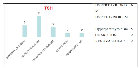 This cross-sectional study was conducted from May 2017 to June 2018. Investigations clearly demonstrated that the prevalence of Secondary Hypertension, including endocrine and renovascular hypertension, was 8.1% among 566 hypertensive patients in our clinic. Amongst 437 patients investigated for secondary hyperten- sion, 114 were sent for the Renal pathology, 42 were found to have Renoparenchymal disease; 25 were having Acute Renal Failure. Another 15 patients had Calculi and 29 patients had chronic glo- merulonephritis leading to CRF which had been previously con- firmed in all cases (by a positive finding on renal biopsy with his- topathological examination or proteinuria over 2 g/day). Persistent haematuria alone was present in three cases test. In seven cases of hydronephrosis (two known and five newly detected), we could not determine whether the hypertension was caused by the hydro- nephrosis and the resulting partial obstruction to flow. 3 cases had renovascular hypertension with main renal artery stenosis (two uni-lateral and one bilateral) diagnosed by renal arteriography. In addition, there were 2 cases of aortic coarctation onarteriography, one of primary aldosteronism, was clinically diagnosed by adreno- corticotrophic hormone (ACTH)-stimulated adrenal venous sam- pling, 5 had primary hyperparathyroidism; 6 had hyperthyroidism; 11 patients had hypothyroidism on lab investigations. No case of phaeochromocytoma was discovered. 4 patients with hypertension were cured or improved after, transsphenoidal pituitary adenecto- my and 2 patients with coarctation had percutaneous transluminal angioplasty with stenting, all initial and secondary screening tests were found to be sensitive and specific for differentiating SH from essential hypertension (EH).