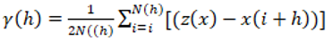 Sampling for points close to each other produces typically similar outcomes compared to sampling for points separated by larger distances. The variogram distance measures the degree ofdissimilarity y(h) between data separated by a vector or class of vectors h. If z(xi) and z(xi + h) are pairs of samples lying within a given class of distance and direction, given N(h) is the number of data pairs within this class, the experimental semivariogram can be defined as average squared difference between the components of data pairs [3].as in the following equation: