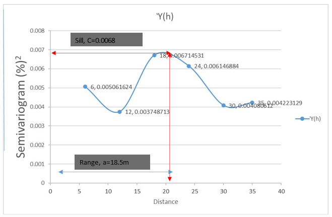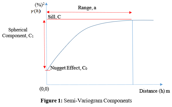 Components of semivariogram are referred to as elements or parameters of semivariogram. They include (figure 1); i. The sill; ii. The Nugget Effect iii. Spherical Component iv. The range or zone of influence. The sill, C is the semivariogram value along semivariogram axis where the curve begins to level out (flatten off), It is measured measured in percentage square, (%)2. The nugget effect, C0, is the value corresponding to the semivariogram axis where the curve cross the semivariogram axis, measured in (%)2. Spherical component, C1, is the value of the semivariogram that correspond with the different between the sill and the nugget effect, measured in (%)2. And the range, a, is the horizontal distance from the origin to the point where the curve started flatten off, measured in meters.