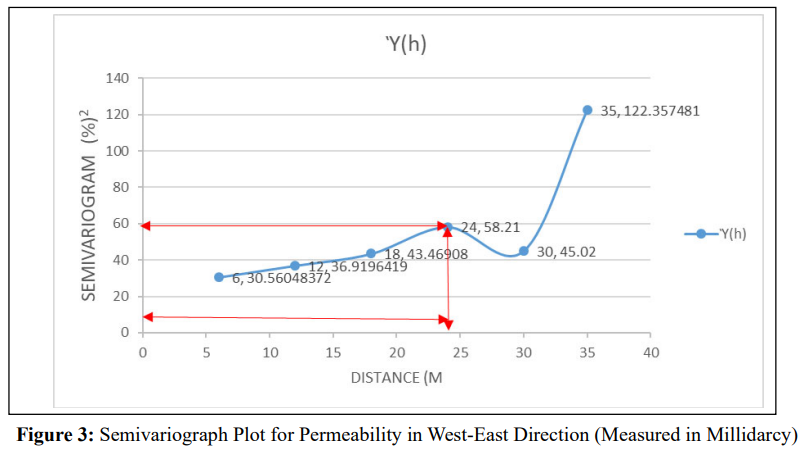 Figure 2 showed that the plot has no nugget effect, C0, i.e. C0 = 0, while the sill effect, C = 59, and range of influence, a = 24m. The plot of the permeability data set did not start from the origin, hence no nugget effect.