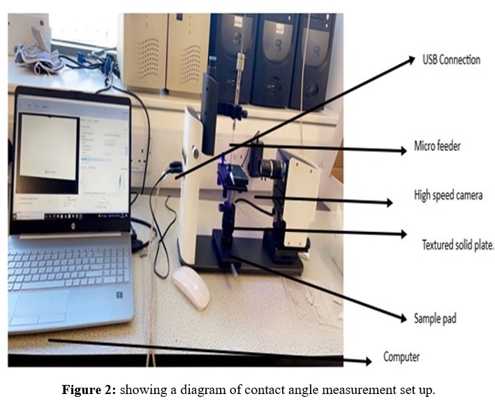 For studying and recording the contact angles created by a single droplet of the model liquid, the computer-connected "One Attention" software program was used. The pictures captured were timed for various seconds at various frames per second (FPS). For the ceramic membrane picture record, the duration was 240 seconds at 50% FPS. The program calculated the angles arising from the model liquid droplet's right and left contact sites with the solid surface and the baseline value. Finally, the program calculated the average contact angle by averaging the angle data from the right and left positions (see Figures 1 and 2).