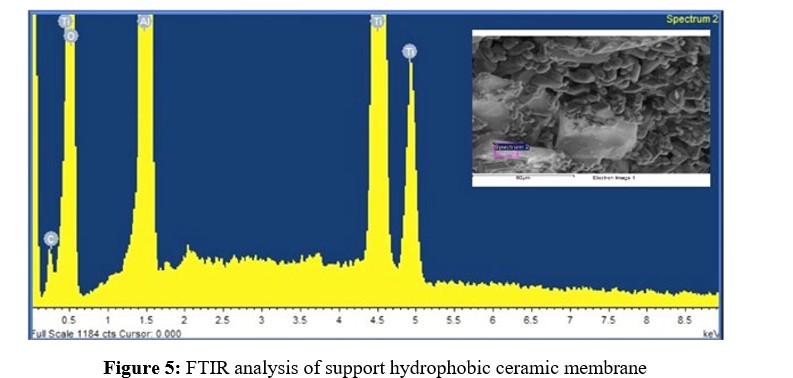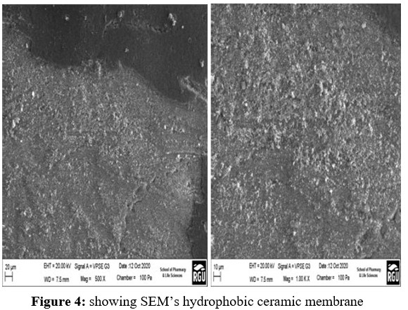 To characterize the particles, SEM examination is used. It is clear from the SEM study that the particles are distributed uniformly across the ceramic membrane's surface. The particles are evenly distributed throughout the entire surface of the hydrophobic ceramic membrane. Notably, the hydrophobic ceramic membrane has a smooth and faultless surface with no fractures. The alumina support's elemental compositions were ascertained using energy dispersive X-ray analysis (EDAX). The observation from contact angle measurements indicates an occurrence of adsorption, suggesting that interactions were taking place. Based on the outcomes, it can be deduced that the ceramic membranes used possess hydrophobic properties. The experimental contact angle results, employed as a characterization technique, validated the distinctions in the surface's physicochemical attributes. Interpretation of these results suggests that the ceramic membrane's surface free energy indicates relatively lower interactions with water. This outcome indicates a low surface free energy for the sample, signifying limited interaction with the liquid.