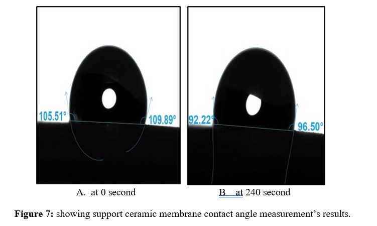 The contact angle investigations were carried out using the Attention Theta Lite contact angle measuring equipment. To test wettability, the sessile drop technique was used to drop model liquids onto the pelleted materials. A model liquid (water) was employed to determine the static contact angles. The DIM was approximately 5.5 for ceramic membranes with pore size of around 15nm, and the average volume of water droplets upon initial contact with the solid surface served as the model liquid's average droplet volume.