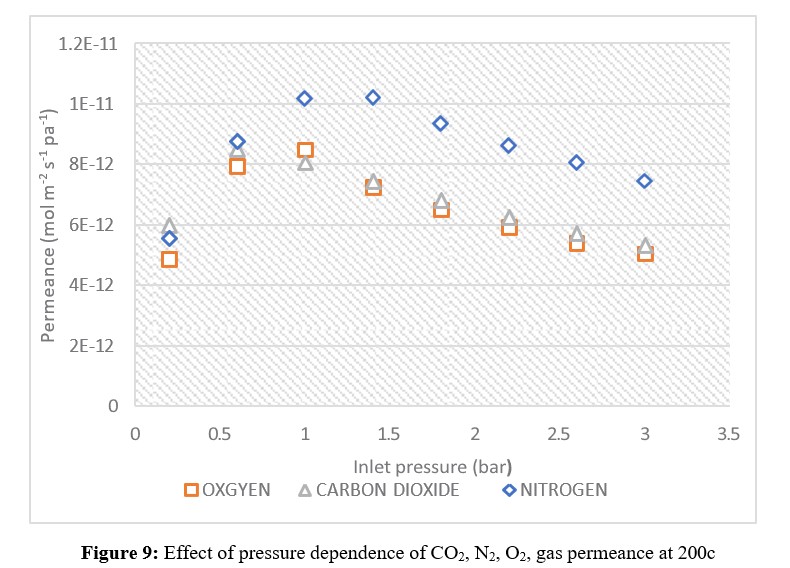 Where Q is the permeance (mol m-2 s-1 pa-1); F is the molar flow (mol/sec.); A is the membrane area (m2); and P is the pressure differential (Pa) across the membrane. Effect of pressure dependence of CO2, N2, and O2, gas permeance at 200c, is shown in figures (9).