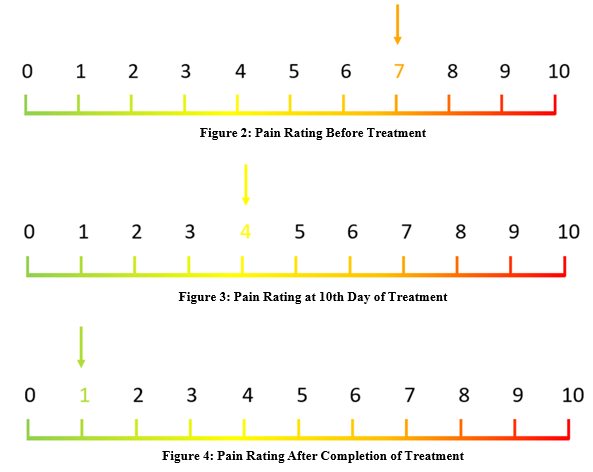• Initial assessment: Pain was scored on Mankoski’s Pain Scale as a 9/10 in the morning and a 7/10 altogether [18].