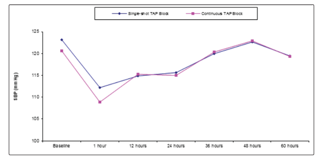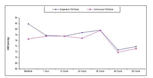 Table 2 and Figure 1 reveal and display that there was no statistical significant difference between single shot TAP block and continuous TAP block research groups as regards SBP at different time intervals, baseline, 1 hour, 12 hours 24 hours, 36 hours, 48 hours and 60 hours (p values = 0.082, 0.112, 0.228, 0.062, 0.210, 0.393, 0.474 consecutively).