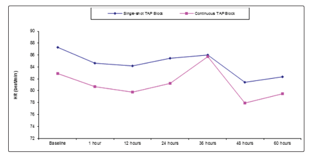 Figure 3: HR among Single-shot TAP Block and Continuous TAP Block research groups at different time intervals