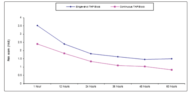 Results: VAS scoring (Visual Analog Scale for Pain) was statistically significantly lower among continuous TAP block research group in comparison to single shot TAP block research group at different time intervals,baseline,1 hour,12 hours 24 hours,36 hours 48 hours 60 hours (p values =0.000, 0.001, 0.001, 0.002, 0.026 consecutively).