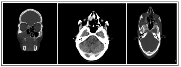 The clinical examination was carried out systematically and bilaterally from the first consultation, and which was carried out firstly without preparation of the nasal cavities and secondarily after preparation based on wicks soaked in xylocaine naphazoline 5%. This examination made it possible to show: a gray, unilateral, multi-lobed and bleeding tumor process on contact in all patients. All cases underwent facial CT visualized a unilateral tumor process extending to the maxillary sinus (Figures 2, 3, 4).